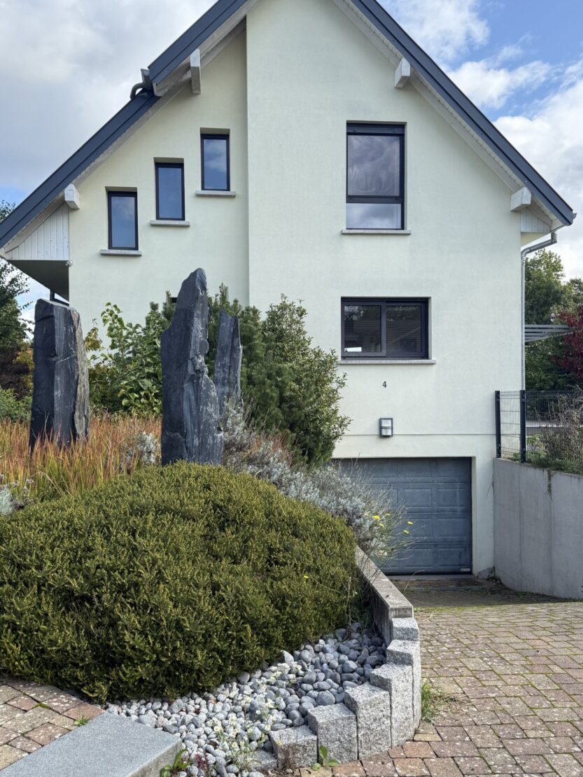 Modernes, Funktionales Haus mit ca. 125 m² Wohnfläche, eingebettet in einer grünen Oase. Großer Wohnbereich mit offener Küche und Zugang zum Garten und zur Terrasse. 4 Schlafzimmer, 2 Badezimmer. Untergeschoss mit großer Garage, Heizungsraum (elektrische Fußbodenheizung), Werkstatt, Abstellraum. Photovoltaische Module. Schöner Garten mit zwei Terrassen, sehr schöner freier Blick auf die Felder und Welder. Keine Durchgangsstraße, in einer Sackgasse gelegen!