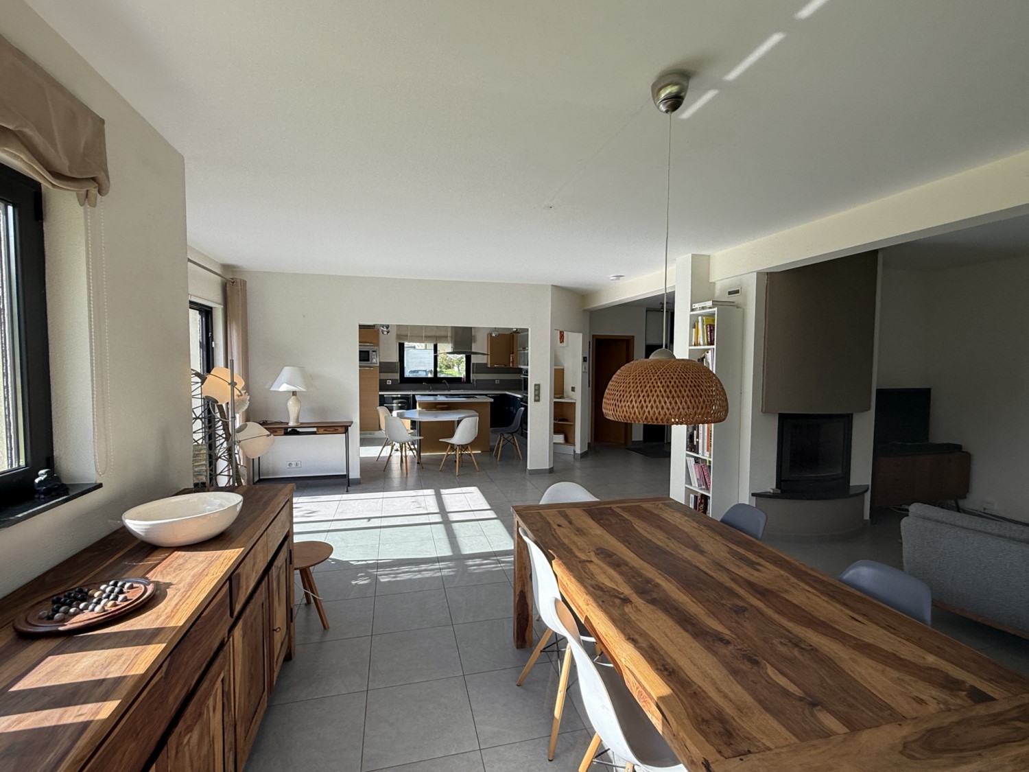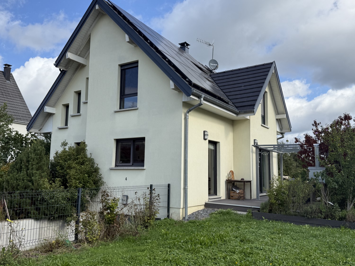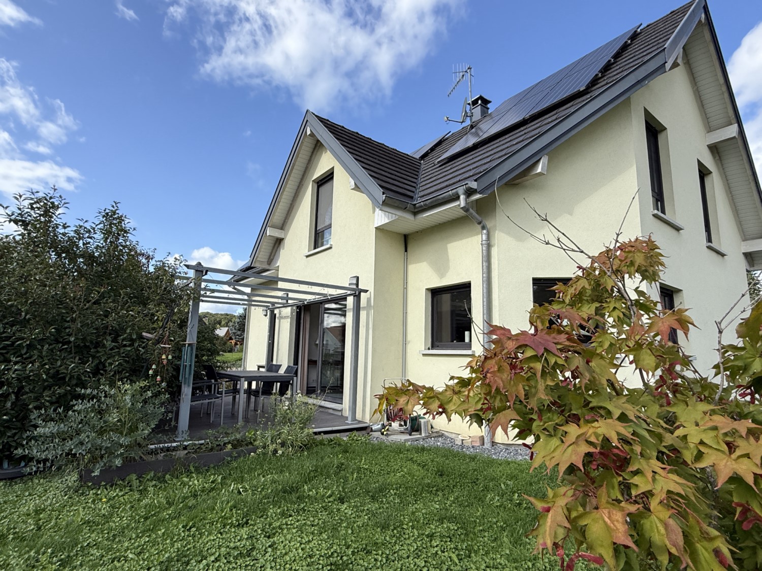 Beautiful recent house in a cul-de-sac, small residential neighborhood. Ideal for a family with children, pets... Large living space with open kitchen. Approx. 140 m² (on the ground), access to terrace and garden. 4 bedrooms, 2 bathrooms. Basement with garage for 2 cars, workshop, storage room. Electric and underfloor heating. Photovoltaic solar panels. Garden with terrace and magnificent view, surrounded by nature!