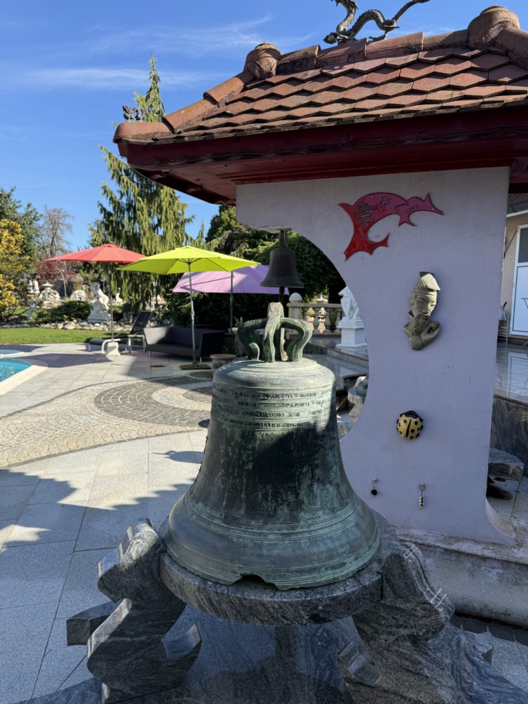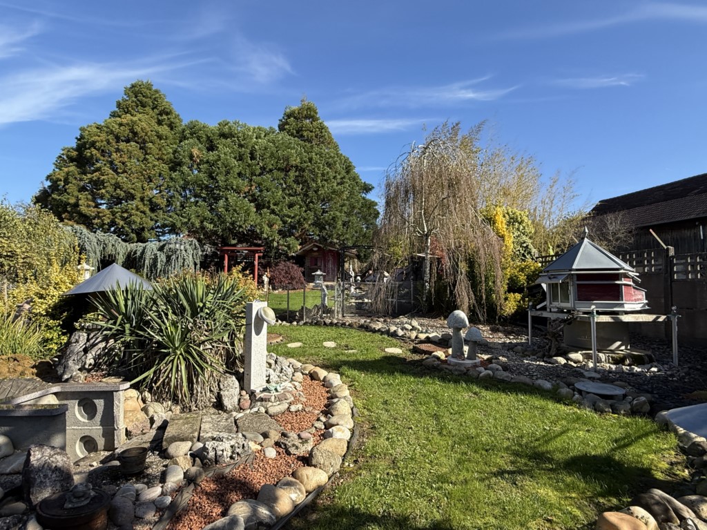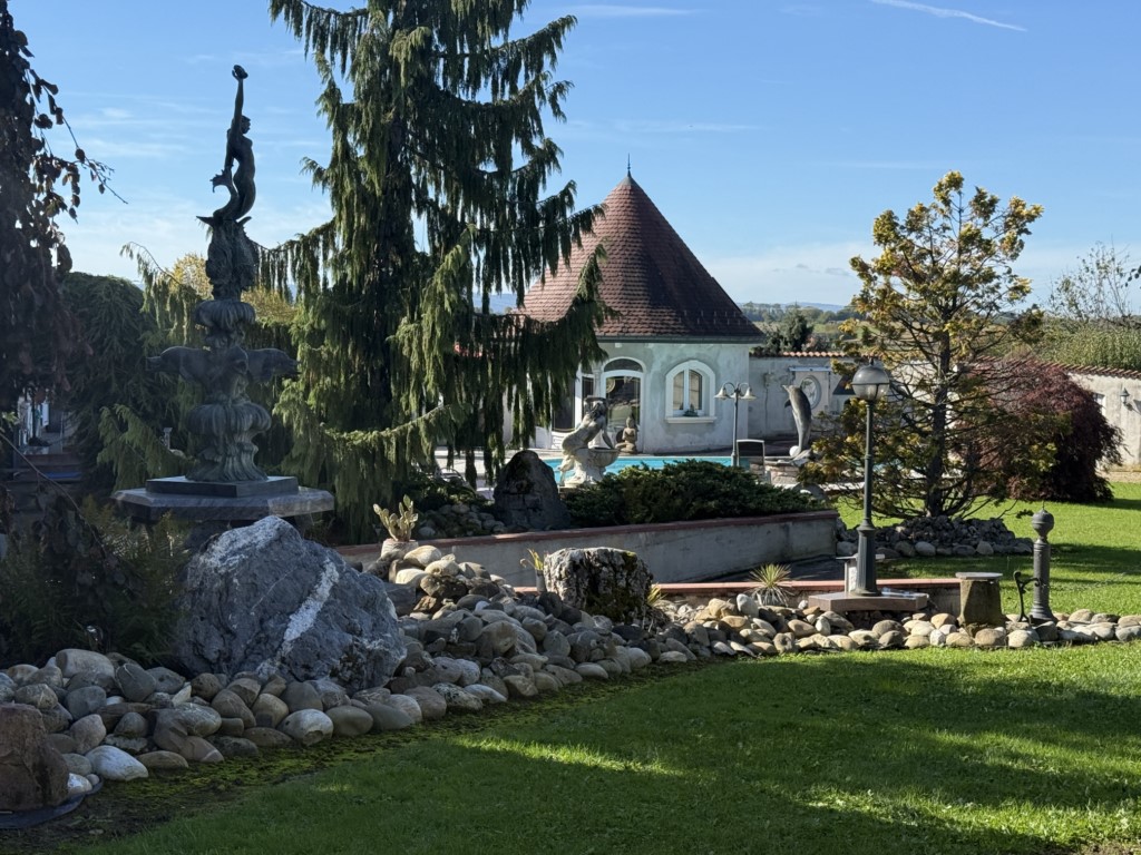 Extérieur: magnifique terrain clos et paysager, piscine en L d’env. 30 m² avec grande terrasse env. 50 m², pavillon env. 20 m² (plafonds hauts), BBQ pivotant, cour anglaise, 6 volières, arbres fruitiers + arbres rares, chenil pour chiens, pont Etter.