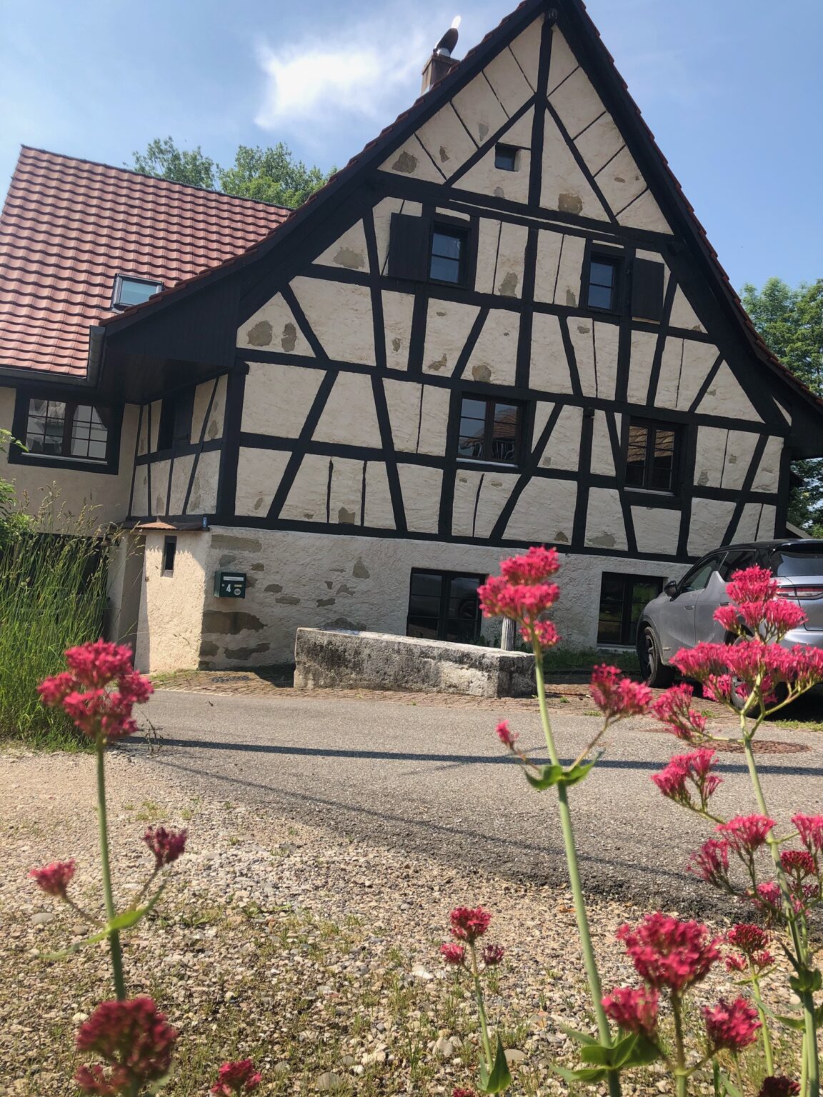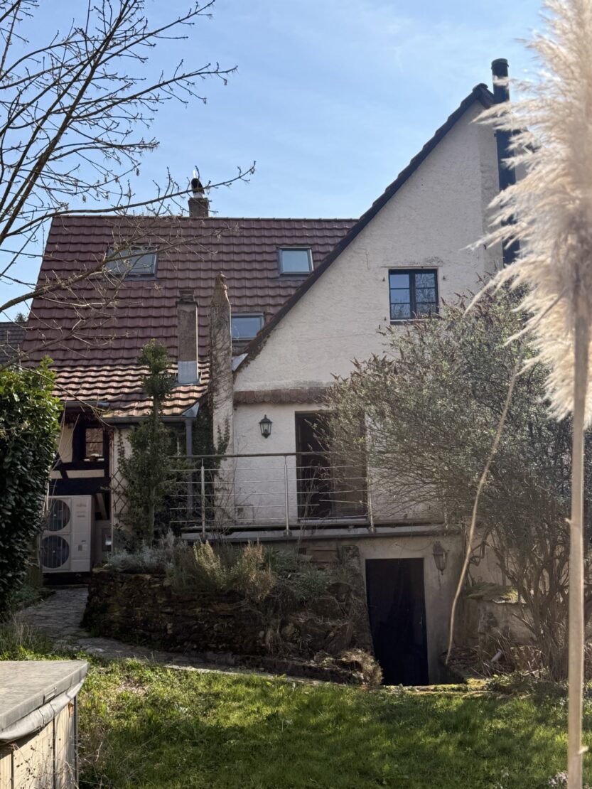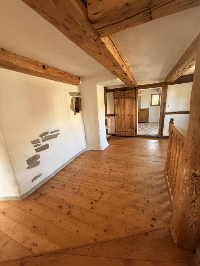 Traumhaftes Riegelhaus mit Natursteinmauerwerk, super Zustand. Charme & Cachet, fantastische Atmoshäre! Schöner Garten 600 sqm und tolles Umfeld mit ruhiger Panorama-Sicht. Sackgasse, idyllisch, kein Verkehr, ideal für Kinder. Parkplatz und Brunnen.