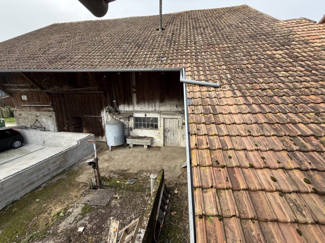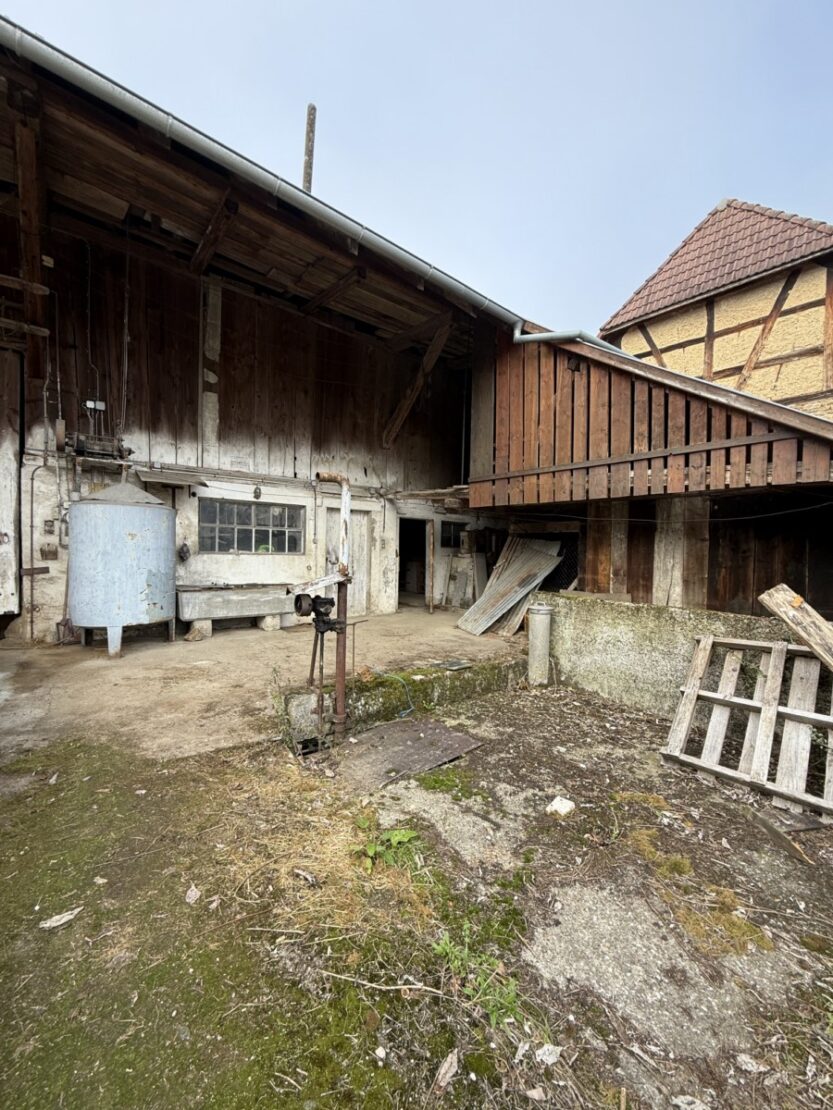 Sundgau - Hirsingue proche centre env. 10 min à 40 min de Altkirch, Waldighofen ,Airport, Palmrain, Bâle, Reinach / ISB: Ensemble maison, 2 granges avec étable, divers ateliers, pièces de stockage sur env. 26 ares constructibles. / espace de vie avec kachelofe env. 30 m² / cuisine avec coin repas / 5 chambres, 1 salle de bain, 2 WC / Combles aménageables. Situation calme et ensoleillé, en impasse, école et aire de jeux à 2 pas.
