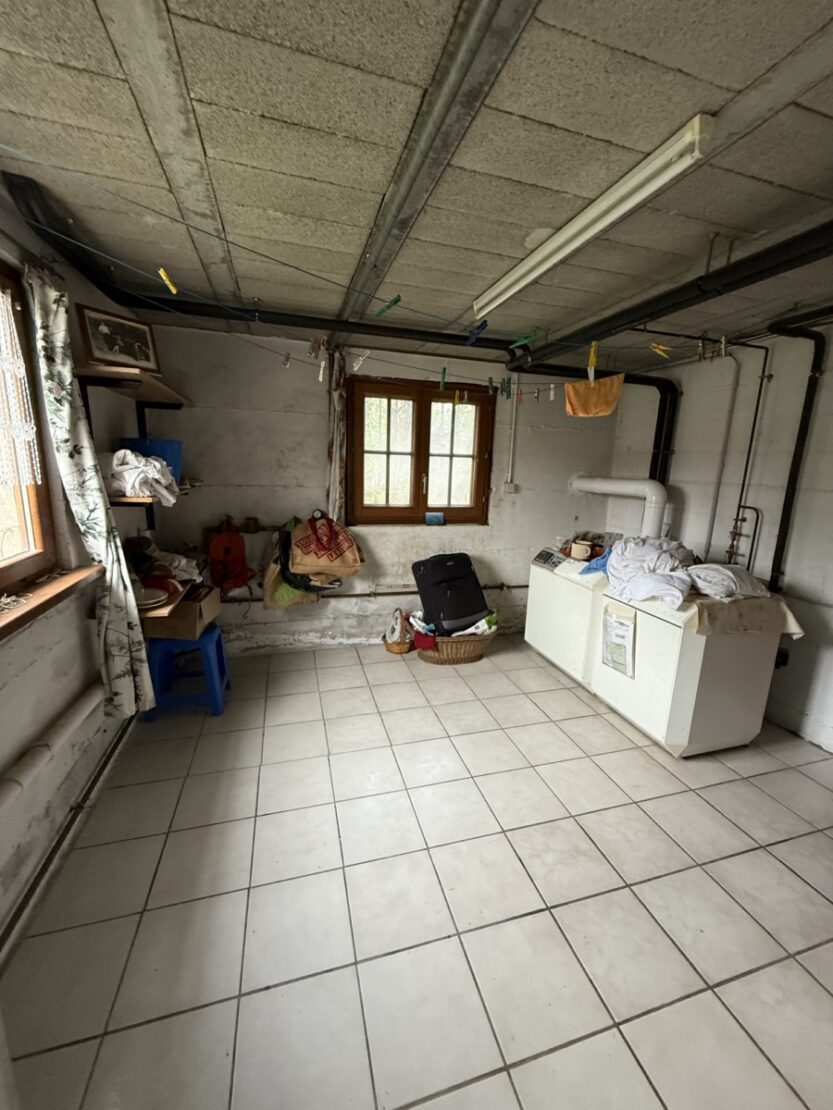 Rez de jardin: sas d'entrée / véranda, buanderie, chaufferie (chauf. gaz de ville) + bois, panneaux photovoltaiques, garage pour 2 v., atelier, cave à vin / stockage. Superbe terrain env. 26 ares avec deux granges, ancienne étable, remise, stockage, hangar avec possibilité pour camping car, réserve bois, potager, divers arbres fruitiers, serre. Cabanette de jardin. Cour.