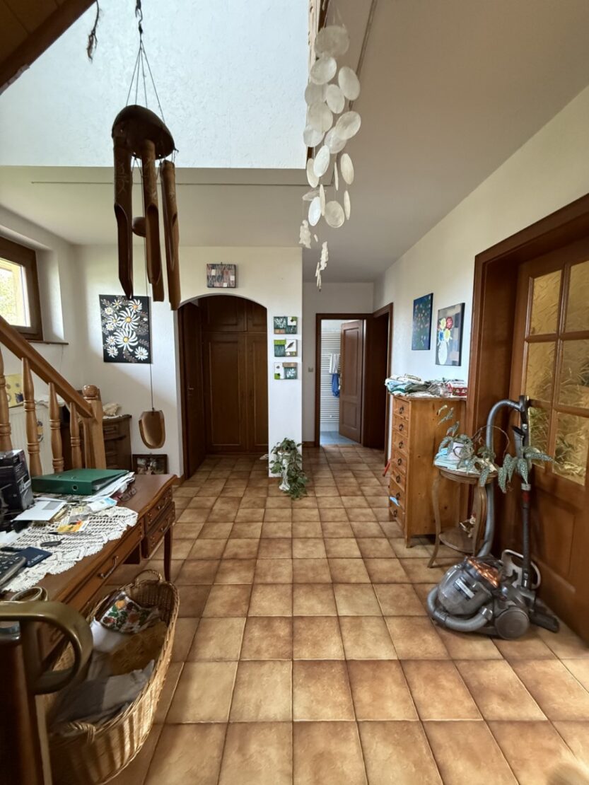 Sas d'entrée avec véranda, salon-séjour avec kachelofe, cuisine + coin repas, 5 grandes chambres spacieuses, plafonds hauts, parquet bois massif, escalier en chêne, 2 velux triple vitrages avec volets électrique. Installation de panneaux photovoltaïques (2023). Annexes avec hangar parfait pour camping car, 2 granges avec possibilité d'aménagement, divers ateliers, étable, stockage.. potager, arbres fruitiers. Assainissement relié au tout à l'égout. Fibre optique.