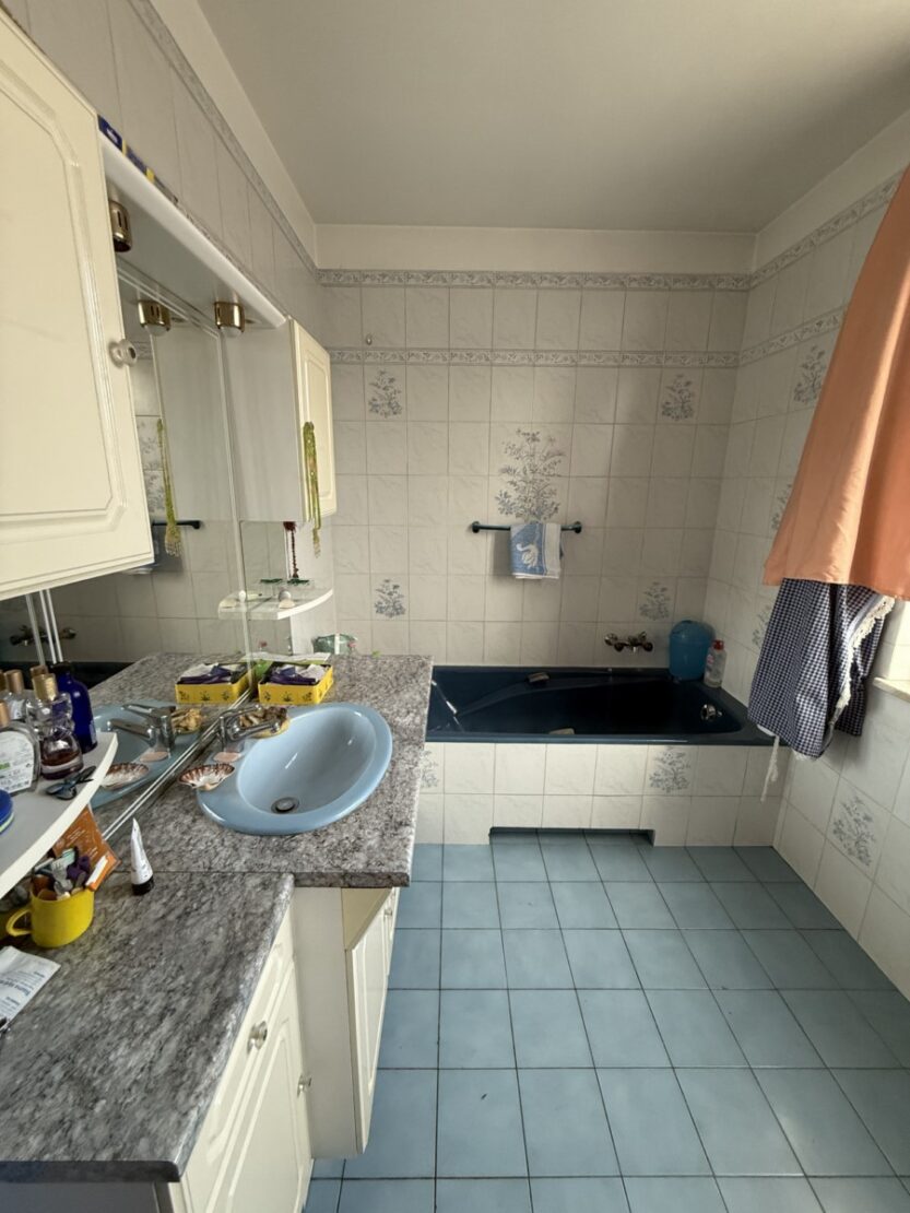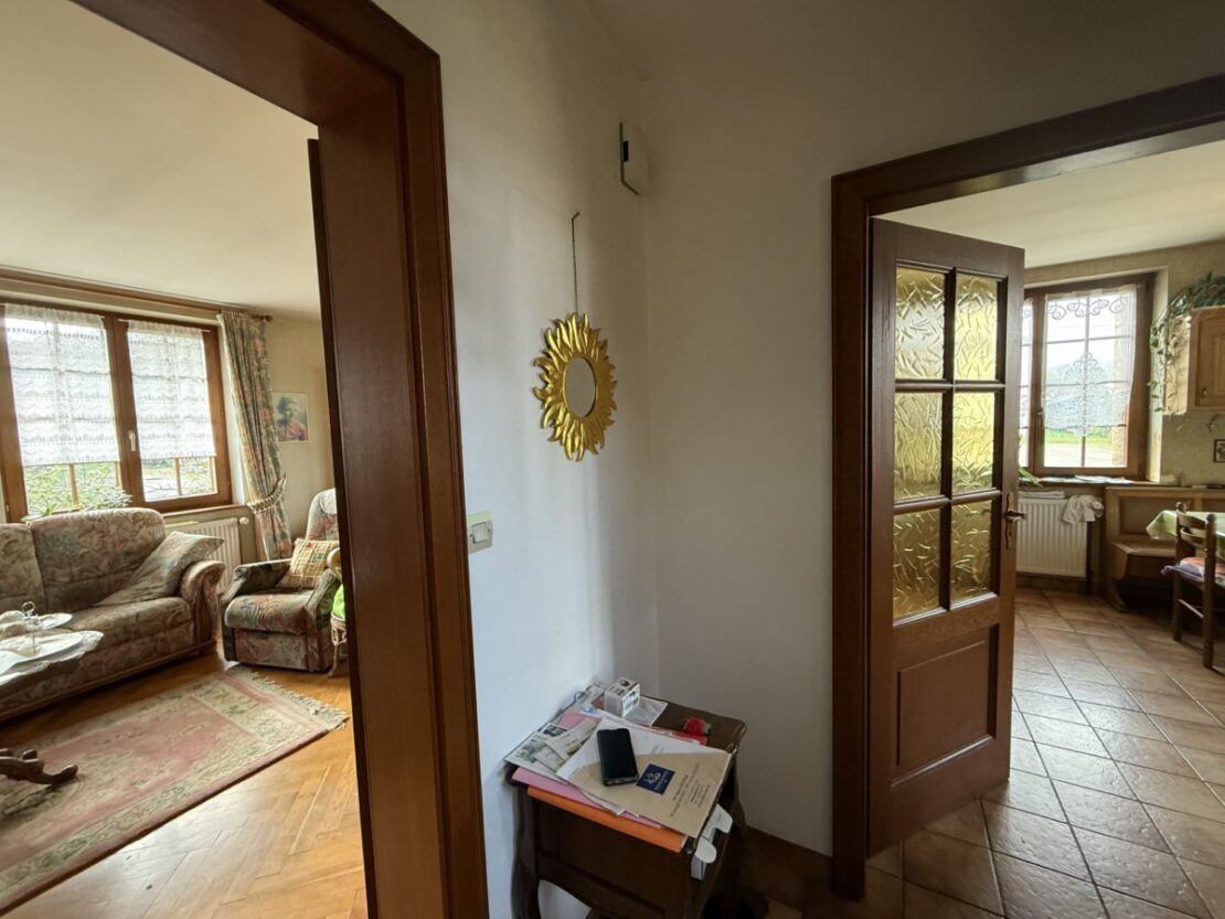 1er étage: couloir avec placard, cuisine + coin repas, salon-séjour avec kachelofe, 1 chambre, WC séparé, 1 salle de bain