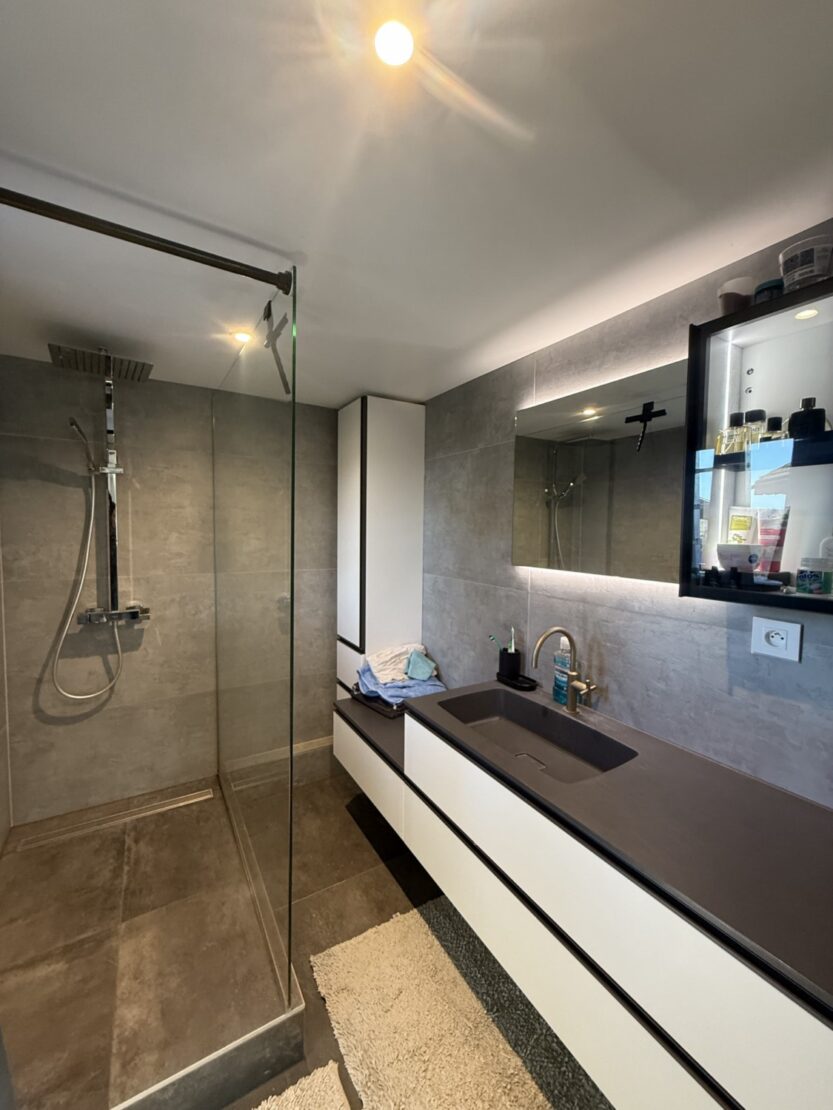1er étage: chambre, salon-séjour avec sortie sur la terrasse, salle à manger, salle d’eau, cuisine