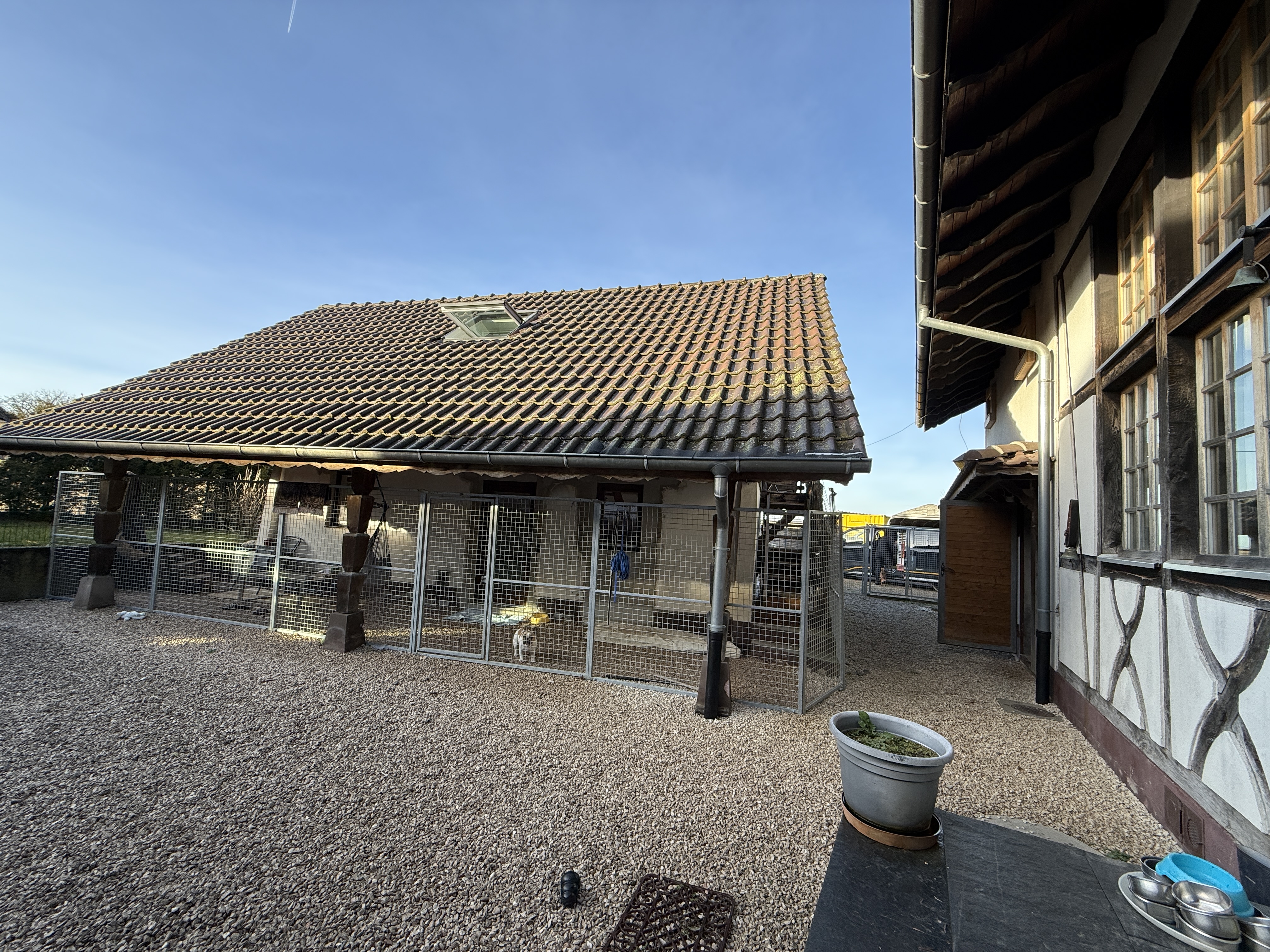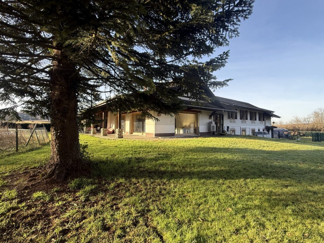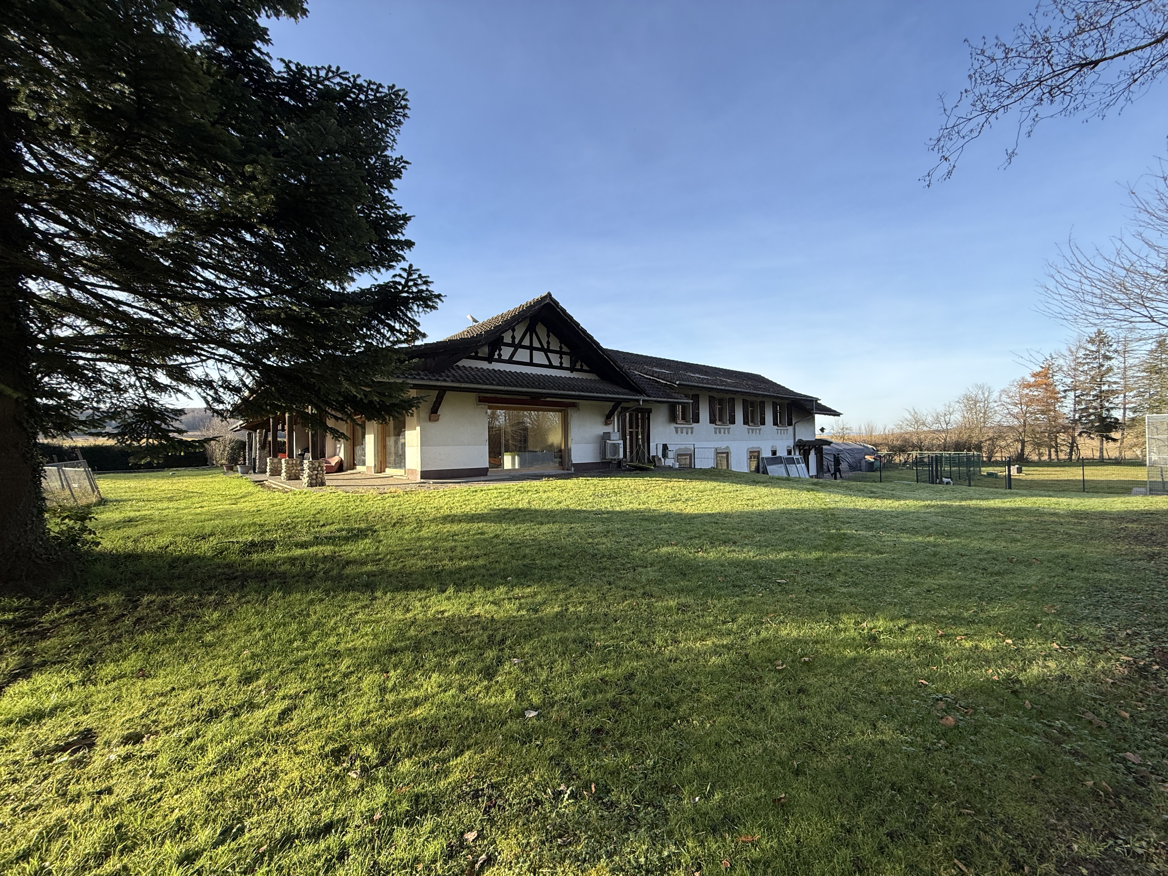 11160 - Magnifique ensemble maison principale + maison neuve secondaire, un vrai paradis pour chiens, poneys, perroquets idéal chenil pour chiens! Garage, grande cour d'entrée. Terrain 3 hectares env., grande terrasse, plusieurs biotopes /// Wunderschönes Anwesen mit 380 m² großem Haupthaus + Neues, mordern eingerichtetes 2-Zimmer-Haus, Nebengebäude und mehreren Anbauten, Garagen ... 4 Schlafzimmer, 3 Badezimmer. XXL-Wohnzimmer! Ca. 3 Hektar großer Garten, ideal für die Haltung von Hunden/Ponys, aber auch für Naturliebhaber und Ruhesuchende! /// Incredible property (dog breeders – even those with many dogs, dog boarding kennels, pony breeders, parrot aviaries, rare in the region, very close to Ferrette. Idyllic location, secluded, neighbors at a distance...