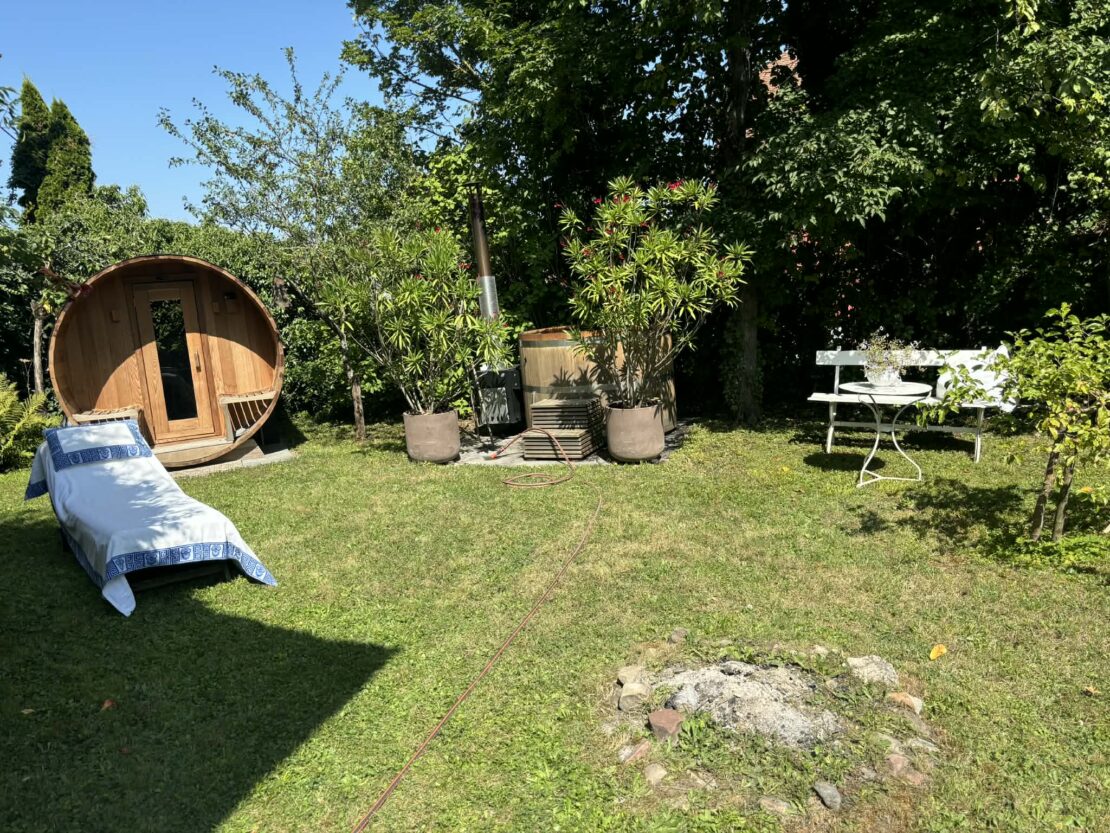some 1100 sqm land, very nice landscaped garden, superb vegetables plot, fire place/BBQ, coverred terraces, a hot tub, a sauna and a storage shed. 2 parking spaces in front of the house!