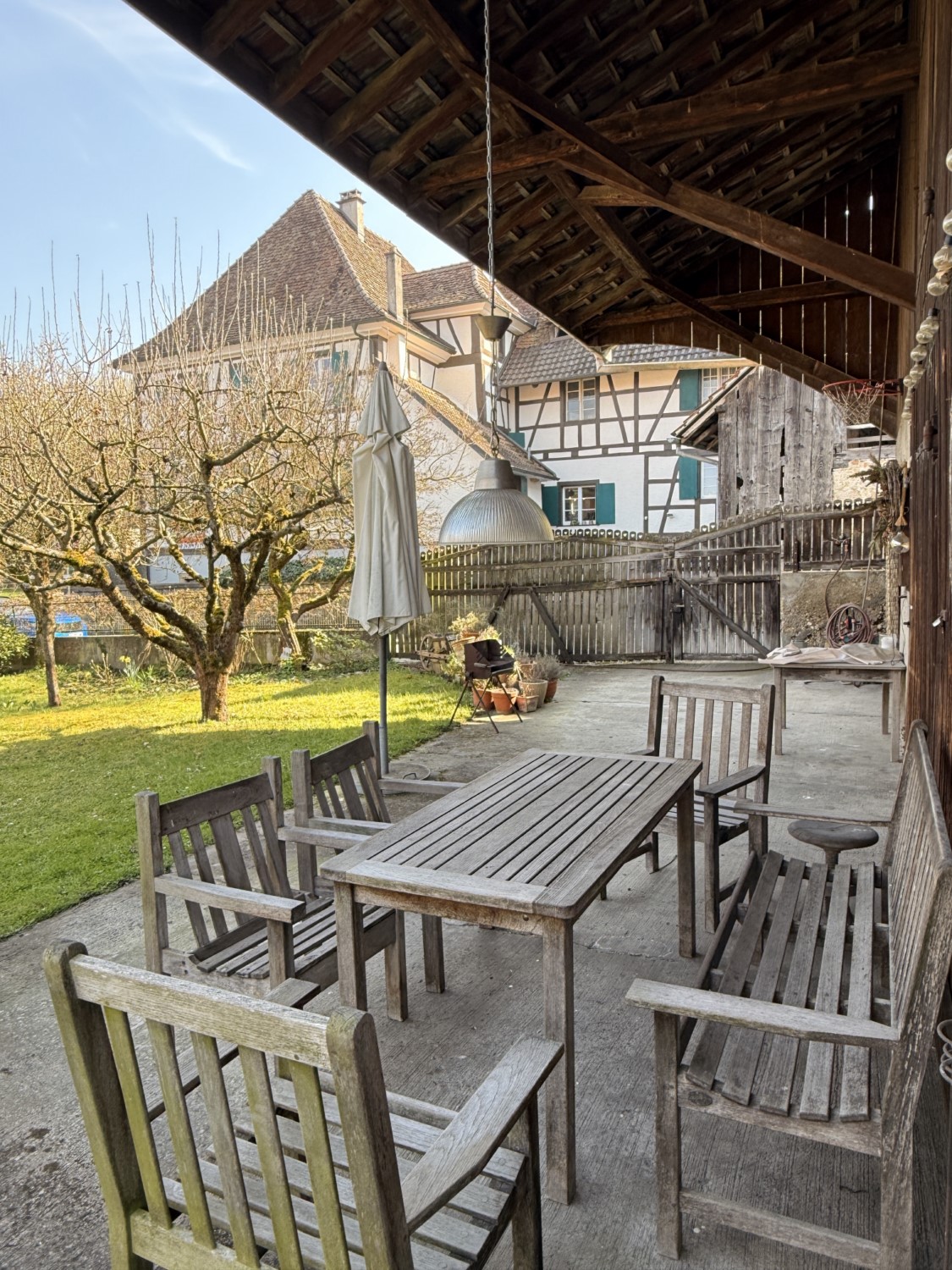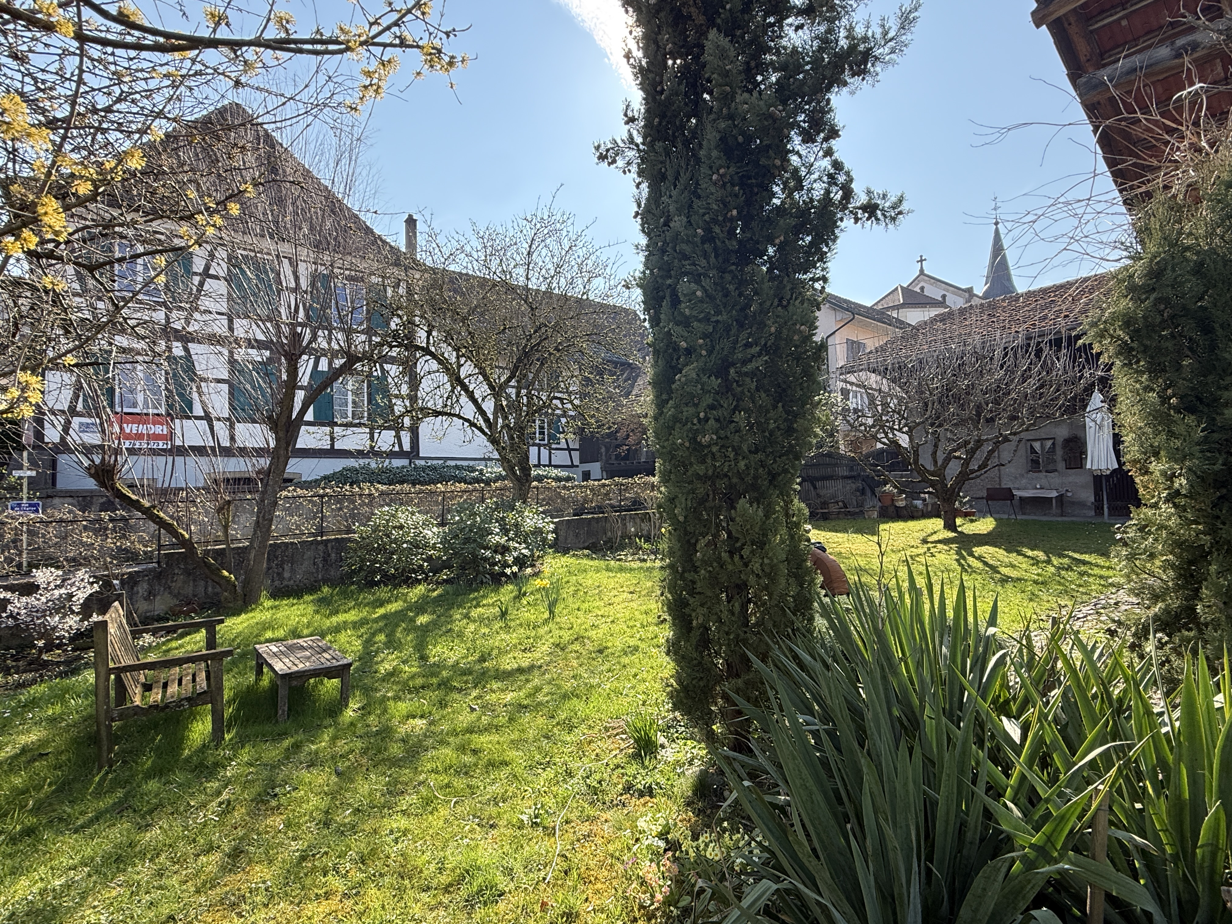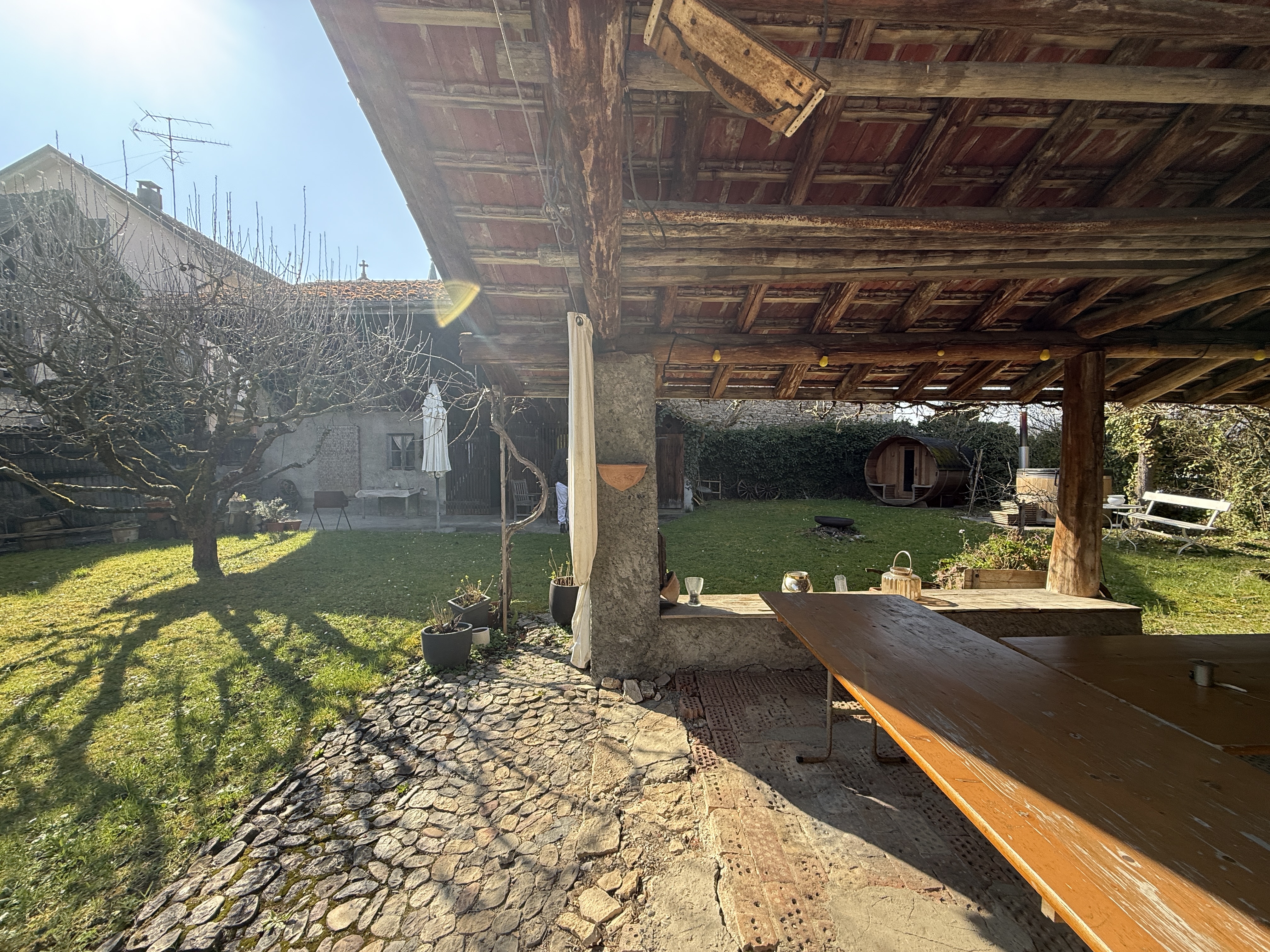 Herrschaftliches Fachwerkhaus im Kern von Leymen mit ca. 210 m² Wohnfläche und angrenzender Scheune, fachmännisch mit ökologischen Materialien renoviert. Das Haus bietet einen großzügigen Wohnbereich von ca. 50 m² sowie eine Küche mit Essbereich von ca. 20 m². Es verfügt über insgesamt 6 Zimmer, darunter eine Masterbedroom, sowie 2 Badezimmer. Hohe Decken, originalem Holzdielenboden, zahlreiche Fenster, eine Holzheizung und mehrere Kamine verleihen dem Haus eine besondere Atmosphäre – eine rundum gelungene „Alt-Neu“-Renovierung. Der Dachboden ist leicht ausbaubar und bietet ein zusätzliches Potenzial. Das Untergeschoss mit hohen Decken umfasst einen Keller, einen Weinkeller, einen Heizraum (Holzheizung mit Kamin sowie Solaranlage für Warmwasser) und bietet einen direkten Zugang nach außen. Zur Immobilie gehören zudem eine Garage sowie ein wunderschön angelegter und gepflegter Garten mit ca. 11 Ar Fläche. Dieser verfügt über eine herrliche überdachte Terrasse, sonnige Bereiche, eine Sauna, ein nordisches Bad sowie ein Nebengebäude mit zusätzlichem Stauraum und Dachboden. Die angrenzende Scheune bietet ein enormes Ausbaupotenzial (2 bis 3 Wohnungen möglich). Die Lage ist zentral in Leymen: Schule, Geschäfte, Restaurants sowie die Tramlinie 10 in Richtung Basel sind bequem zu Fuß erreichbar. Ein wirklich einzigartiges Haus mit viel Charakter in perfektem Zustand – ideal für eine Familie, für Gäste, Haustiere und Naturliebhaber. Auch bestens geeignet für ein B&B, Airbnb, Büros oder freiberufliche Tätigkeiten. Kurz gesagt: Eine außergewöhnliche Immobilie mit 6 Zimmern, 2 Bädern, Keller, Garten, Garage und Terrassen, die Sie an der Schweizer Grenze erwartet. Schreiben Sie das nächste Kapitel Ihrer Geschichte in diesem besonderen Anwesen. Eine seltene Gelegenheit in der Region – ein echtes kleines Paradies!